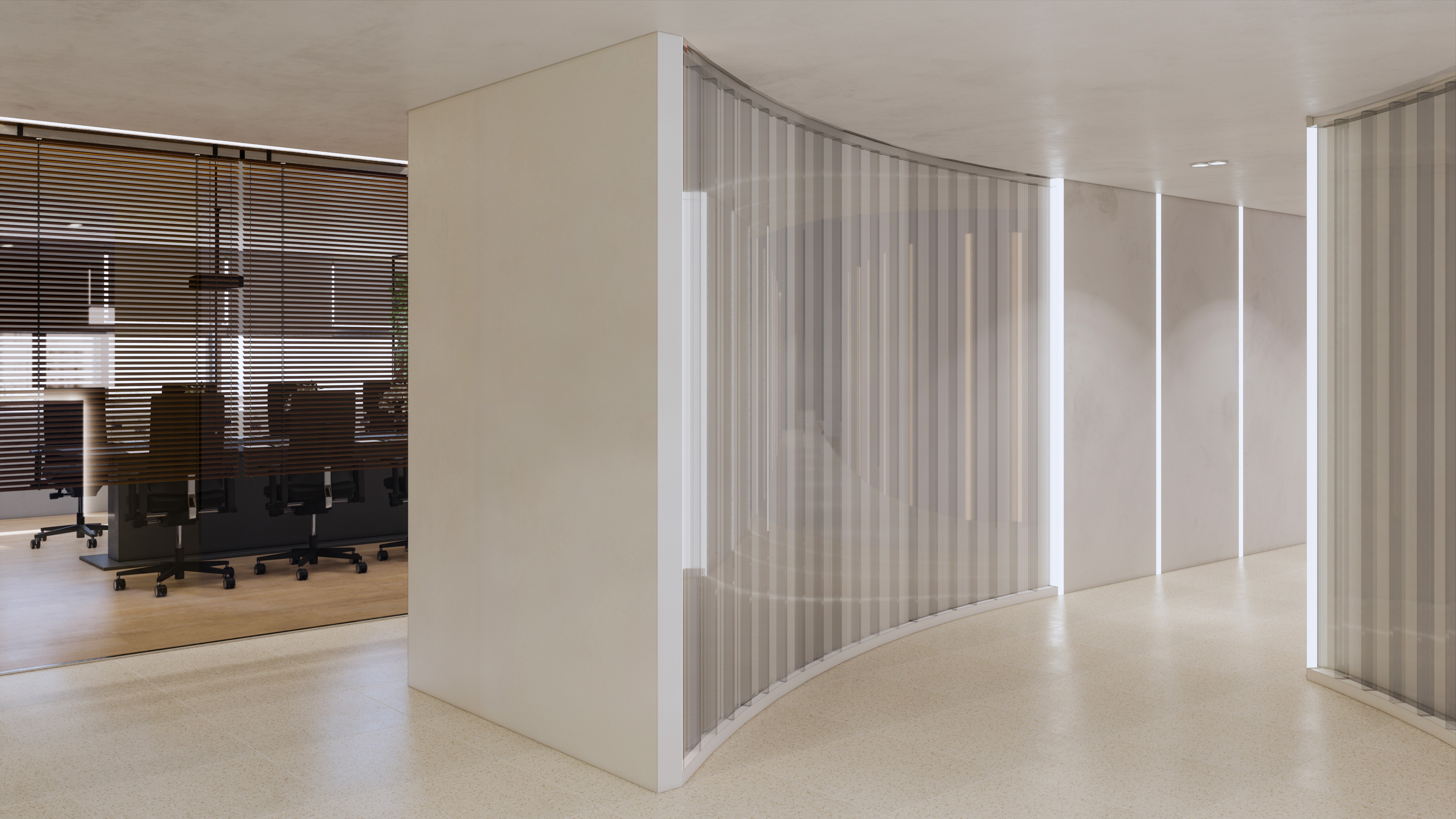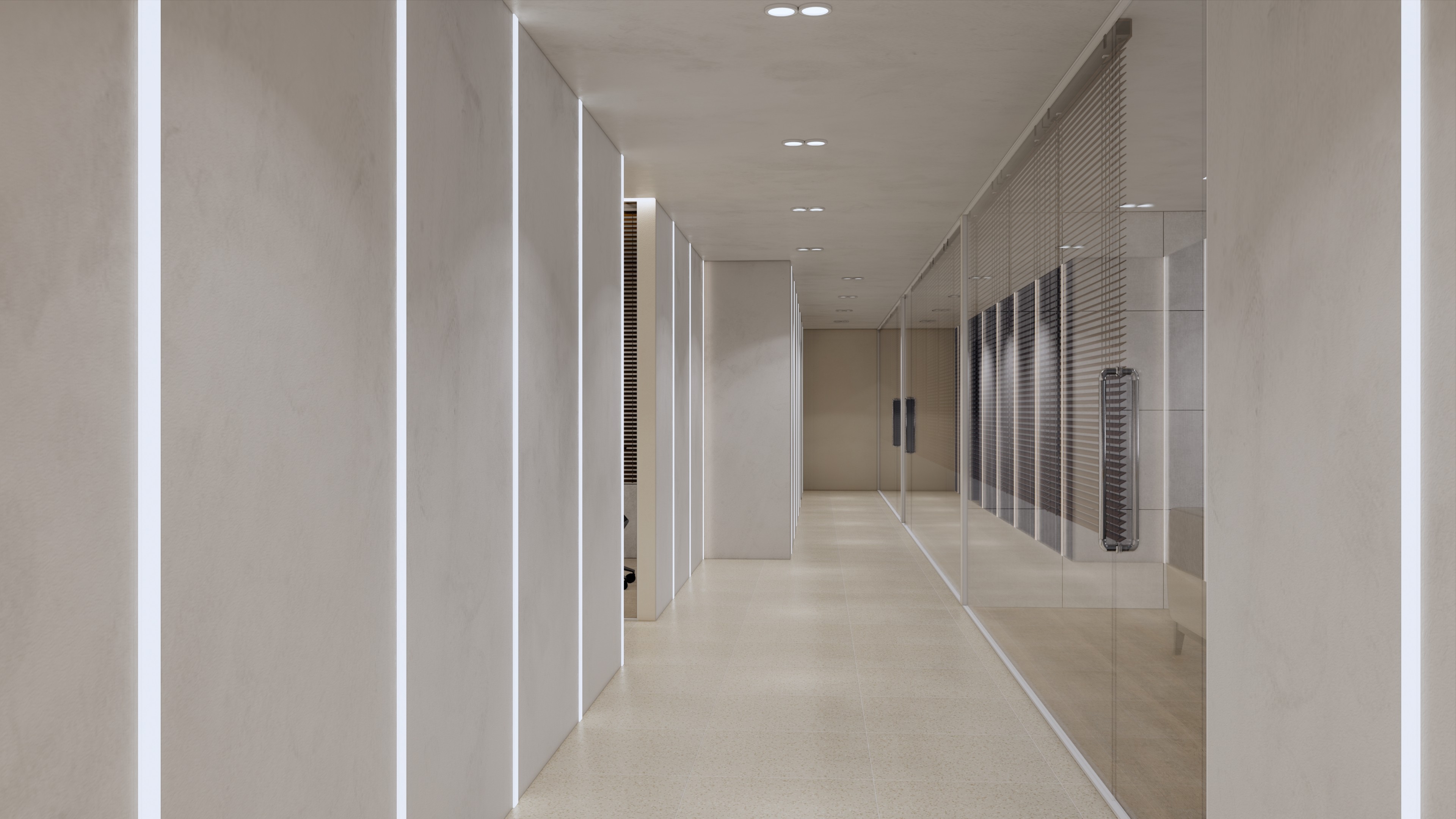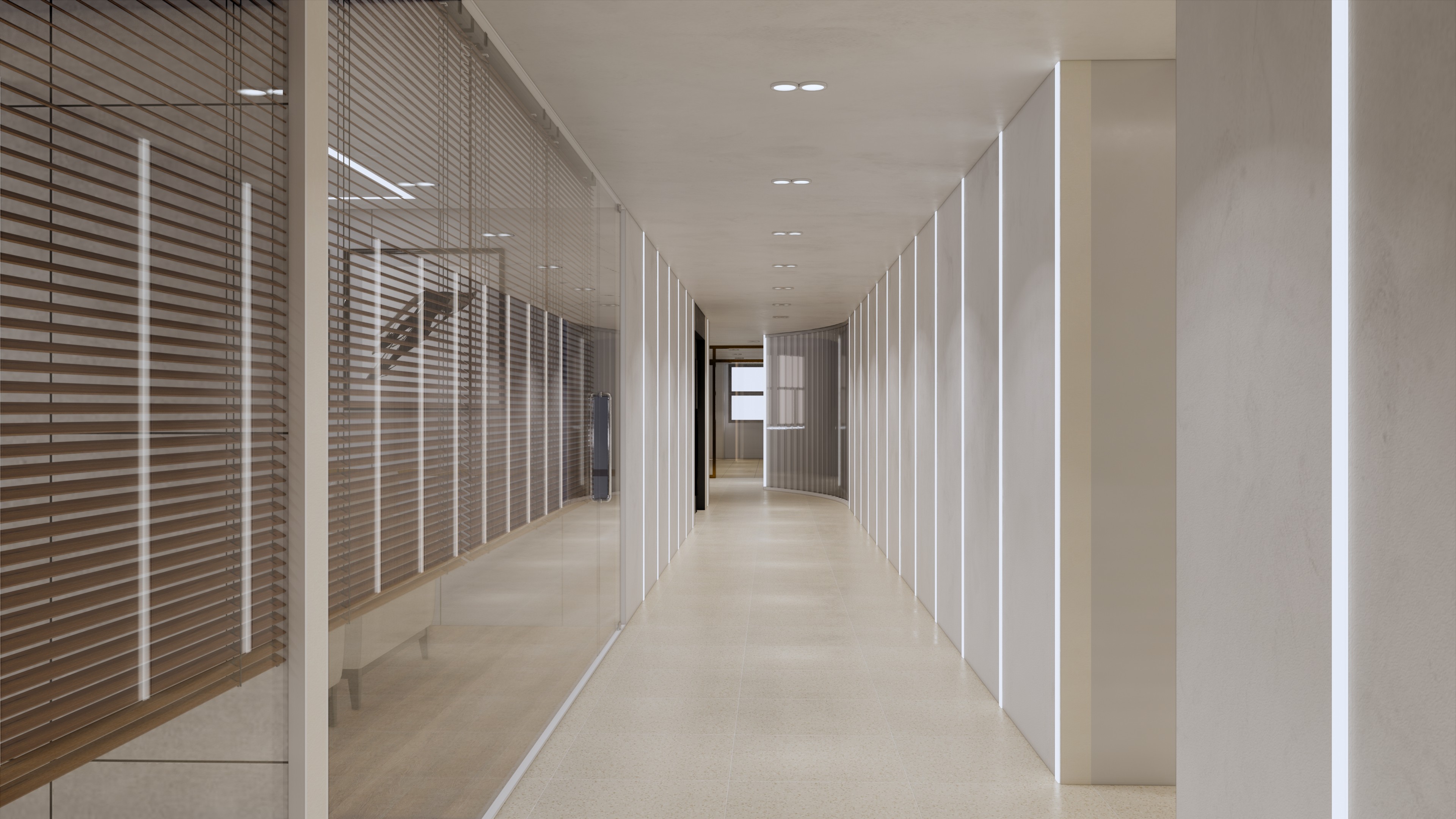 이 사옥 디자인은 전문성과 현대성을 결합한 실용적인 공간을 목표로 하고 있습니다. 베이지 톤의 차분한 색상은 직원들이 일에 집중하고 협업할 수 있는 편안한 분위기를 조성합니다. 이러한 중립적인 팔레트는 사무실에 평온함을 더하며, 공간을 명료하게 만들어 주는 역할을 합니다.