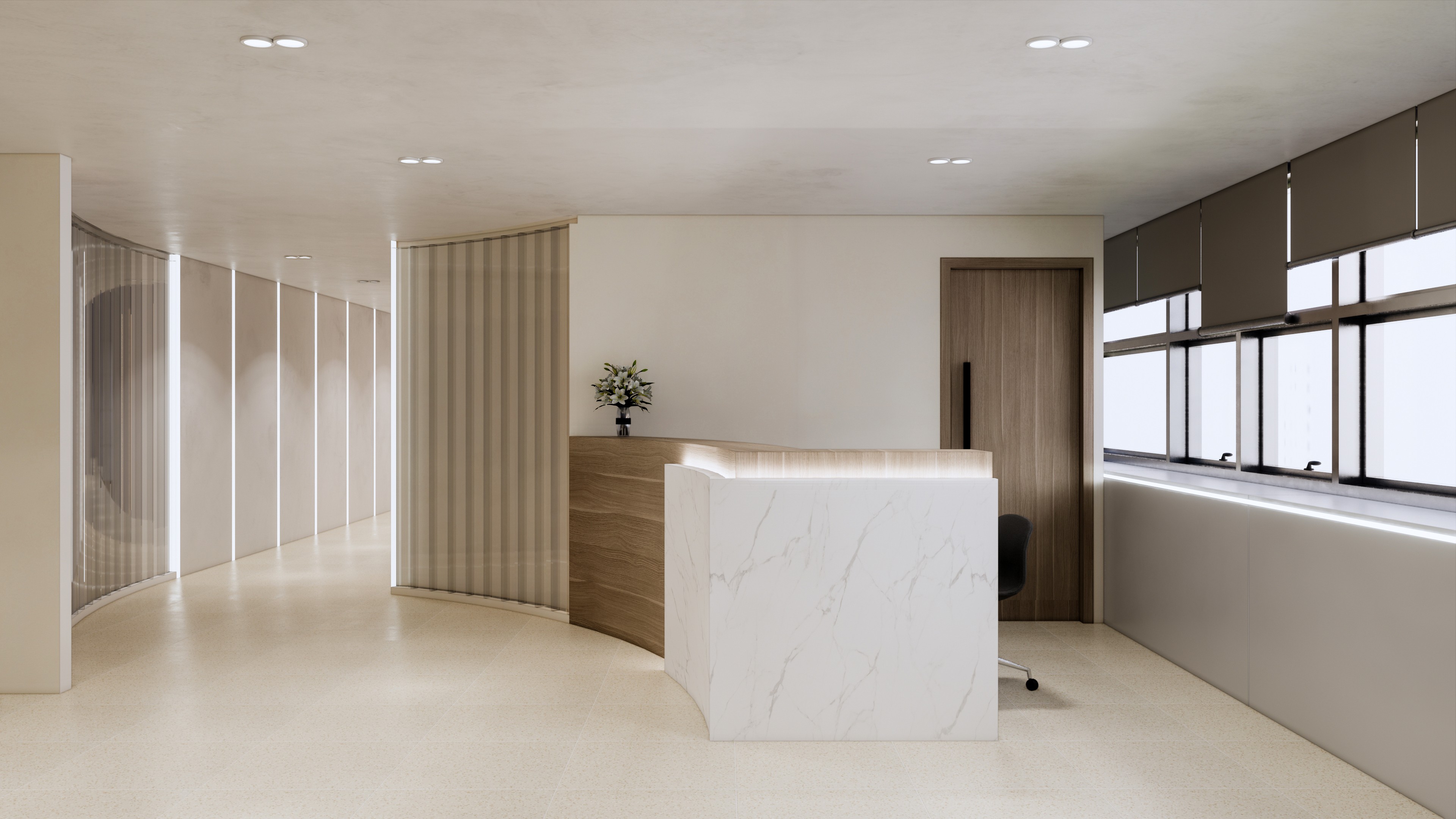 미니멀리즘과 기하학적 형태를 바탕으로 한 디자인 역시 이 공간의 특징 중 하나입니다. 리셉션 데스크는 부드러운 곡선과 고급스러운 재질로 제작되어, 처음 방문한 사람들에게 신뢰감과 전문성을 느끼게 합니다. 첫인상에서 중요한 요소인 리셉션은 이 공간의 디자인 철학을 잘 담아내고 있습니다.