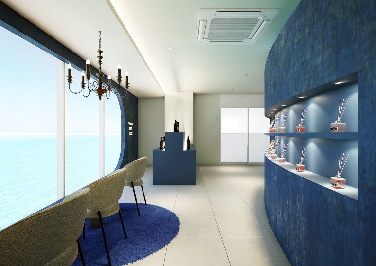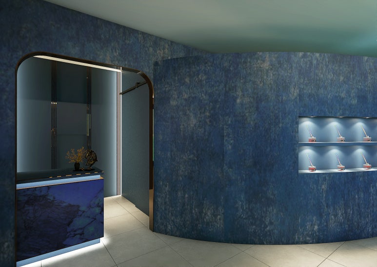곡선의 흐름과 딥블루 톤이 만들어내는 긴장감 속에서도 편안한 리듬을 유지하며, 고객의 체험 동선을 감각적으로 유도합니다.